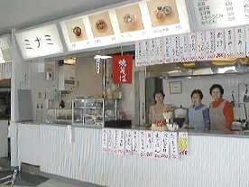 | 元気の良いお親子が切り盛りする明るいお店。たこ焼きもオススメだが 大きいかき揚げがのった「かきあげうどん」(400円)もオススメ。 |