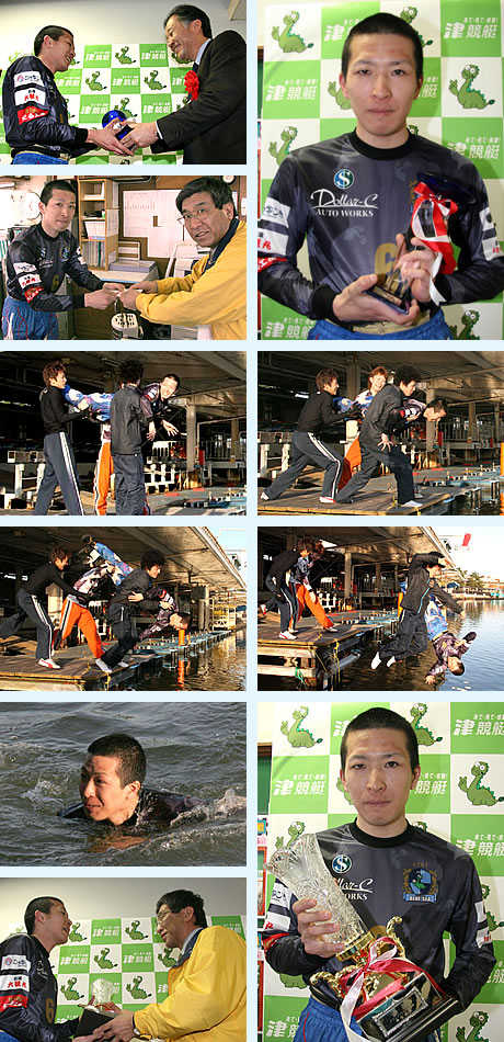 登録番号4261岡祐臣選手が、平成21年3月25日(水)から30日(月)の6日間、津競艇にて開催された「グランプリファイナル戦津商工会議所杯争奪第3回津市長賞」において、初優勝を飾りました。 岡選手は2号艇に乗艇し、3コースからまくり差しを決めて見事優勝いたしました。 表彰式で津商工会議所常務理事の藤谷増郎様より優勝杯が、古谷津市競艇事業部長より津市長賞優勝カップが授与されました。また、(株)朝日屋様より副賞として「松阪肉」が贈られました。 表彰式終了後、岡選手に執行委員長特別賞が授与されました。その後、三重支部選手によって水神祭が行なわれました。 ![]()