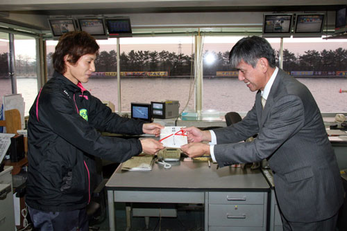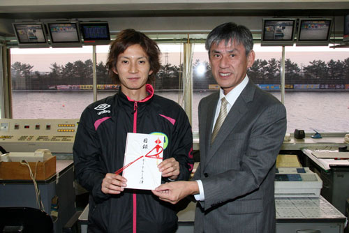 松尾選手は、地元ファンの前で水神祭を挙げ、平松津市競艇事業部長より記念品が贈られました。