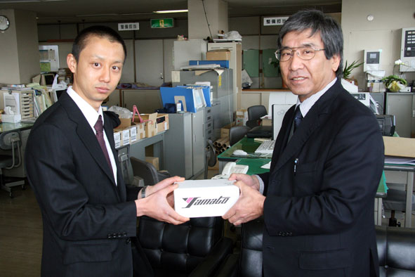 また、古谷津市競艇事業部長から坂井田選手に新らしいペラが贈呈されました。